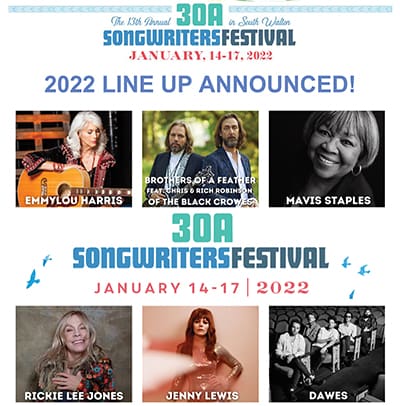 The initial round of confirmed artists for the 13th Annual 2022 30A Songwriters Festival Jan. 14-17 includes iconic artists Brothers of A Feather Feat. Chris & Rich Robinson of The Black Crowes, Dawes, Mavis Staples, Jenny Lewis, Emmylou Harris and Rickie Lee Jones.