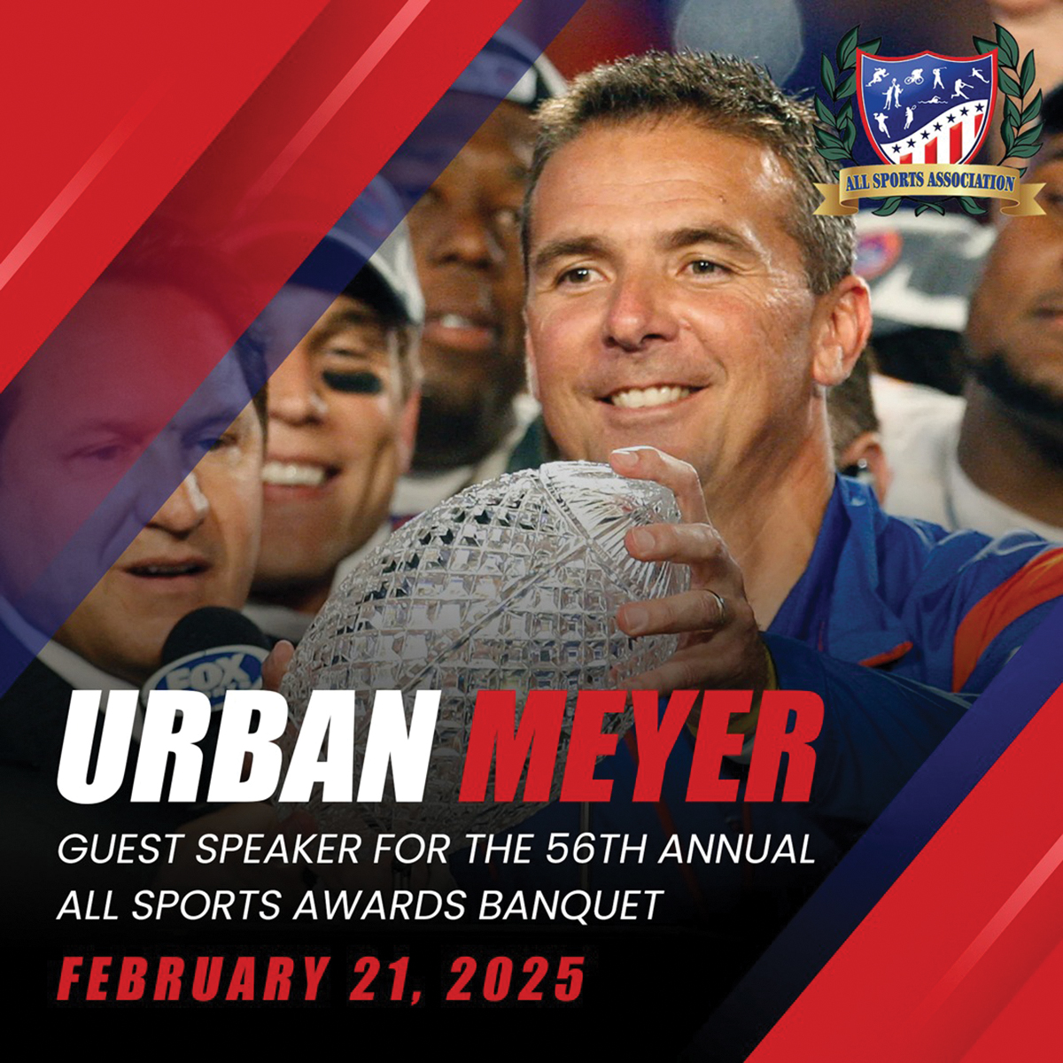 All Sports Association has announced that Urban Meyer will be the guest speaker for its 56th Annual All Sports Awards Banquet, February 21st, 2025. This banquet is a key event for the association, honoring outstanding athletes and people who have significantly contributed to youth sports in the area.