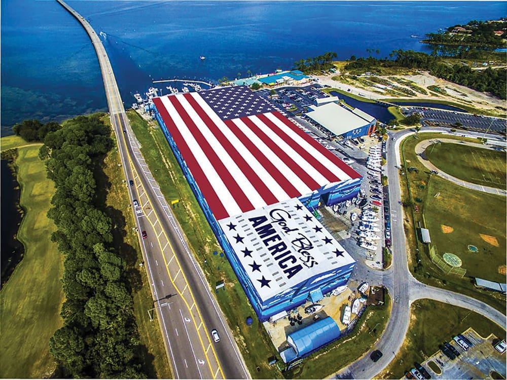 Our hometown American flag mural painted on the roof of Legendary Marine has been confirmed by Guinness World Records to be the largest flag mural in the world and honors our hometown heroes— our military men and women, veterans, police officers, sheriffs, firefighters, coast guard, EMTs and all of our first responders.