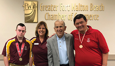 Special Olympics Florida-Okaloosa County provides year-round sports training and competition to children and adults with and without intellectual disabilities, at no cost to the athlete nor the unified partner. “Locally we offer 18 different sports to athletes ages 8 and up helping to develop their fine and gross motor skills, showcase their talents and help achieve physical fitness—the best of all—athletes never age out,” says Pamela. Local athlete, Ann James, age 61, won her first Gold Medal in 1969 (age 11) in S.C. and 50 years later she just won another Gold Medal at State Swim this past October. “Special Olympics is their life! With multiple teams per sport, it’s not one event, but sports, games and competitions that occur almost 365 days a year,” Pamela says. “And research shows athletes achieve better academics, gain self-esteem and life skills necessary to be productive, respected and contributing members of our community with increased public awareness of their capabilities and needs.” Currently 510 athletes in Okaloosa County compete in Basketball, Bocce, Bowling, Cheerleading, Cycling, Flag Football, Golf, Gymnastics, Pickleball, Powerlifting, Soccer, Softball, Stand Up Paddle, Surfing, Swimming, Tennis and Volleyball and soon to offer Equestrian. Each sports season lasts approximately three to four months with at least eight weeks of training and three levels of competition: County, Area and State Games.