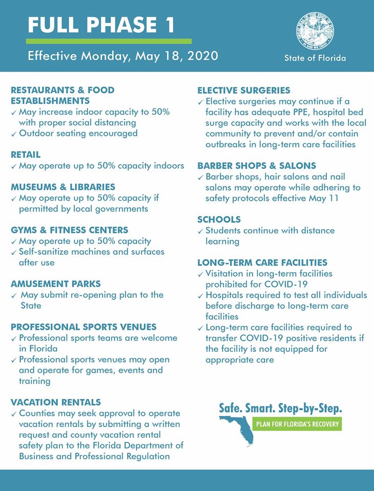 Gyms and fitness centers reopened as well with social distancing and sanitizing of equipment after each use. “If you’re inside, make sure you’re doing the social distance and then sanitize machines and surfaces after use,” Gov. DeSantis said. “I mean, that should be happening anyway.”