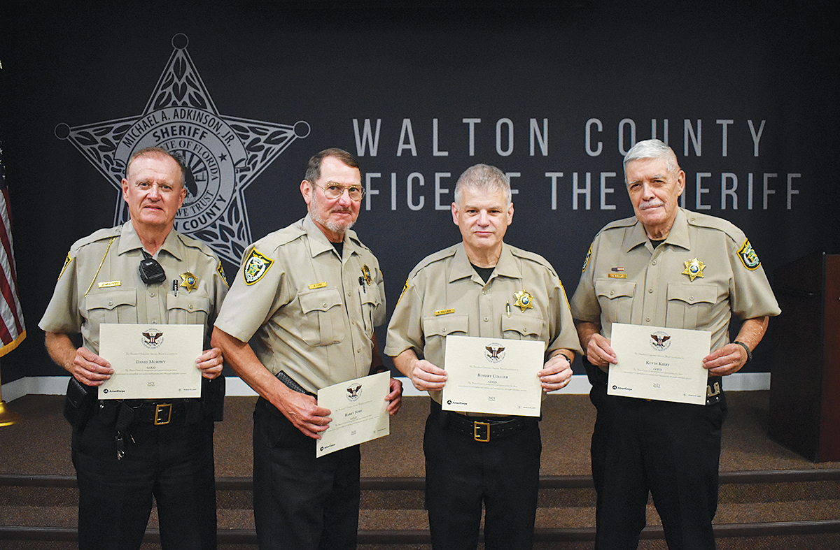AmeriCorps presented the following members of the Walton County Sheriff’s Office Posse with the President’s Volunteer Service Award: Kevin Kirby, who in 2021, volunteered 2,769 hours to the residents and visitors of Walton County. Barry Ford volunteered 1,895 hours in 2021. Robert Collier volunteered 1,108 hours and David Murphy volunteered 1,064 hours. Their service saves the taxpayers and the sheriff’s office thousands of dollars every year. To learn more about the posse visit: waltonso.org.