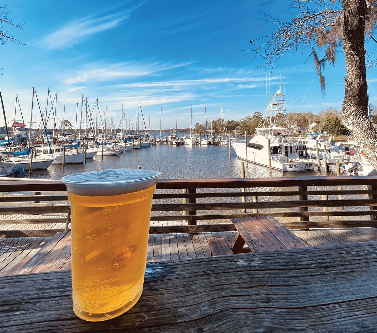 LJ Schooners beer with a viewSuds, Songs, Sunsets and Sports! Welcome to LJ Schooners Dockside Restaurant at the Bluewater Bay Marina Complex. Named after “LJ Schooner” (the LJ is for Lazy Jack), a cherished four-legged icon on Bluewater Bay Marina docks, the open-air oyster bar and restaurant offers a magnificent view of the water, marina and unparalleled sunset any time of year. There are, of course, oysters and a delicious varied menu with dinner specials such as blackened mahi and grilled shrimp with hollandaise, served over cheese grits.