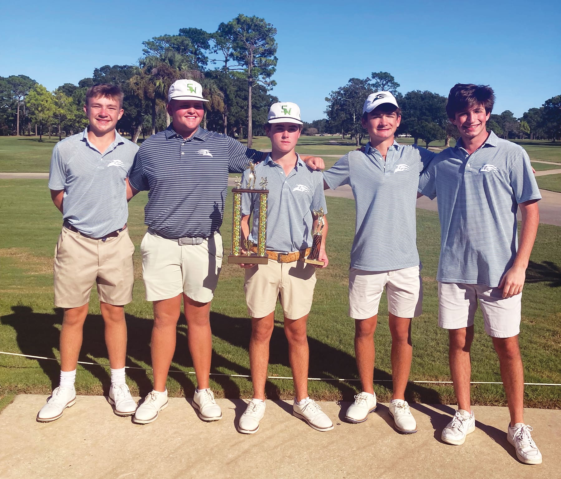 Teams were composed of five players, using the top 4 scores for the total team score. Individual players were scored as well, using the lowest score for the winner. In golf, low scores win! After almost four hours of play, two schools emerged victorious. Destin High’s team was runner-up with a score of 319. South Walton was the winner with a score of 318. This was quite a close battle with only one point separating the second and first place winner.