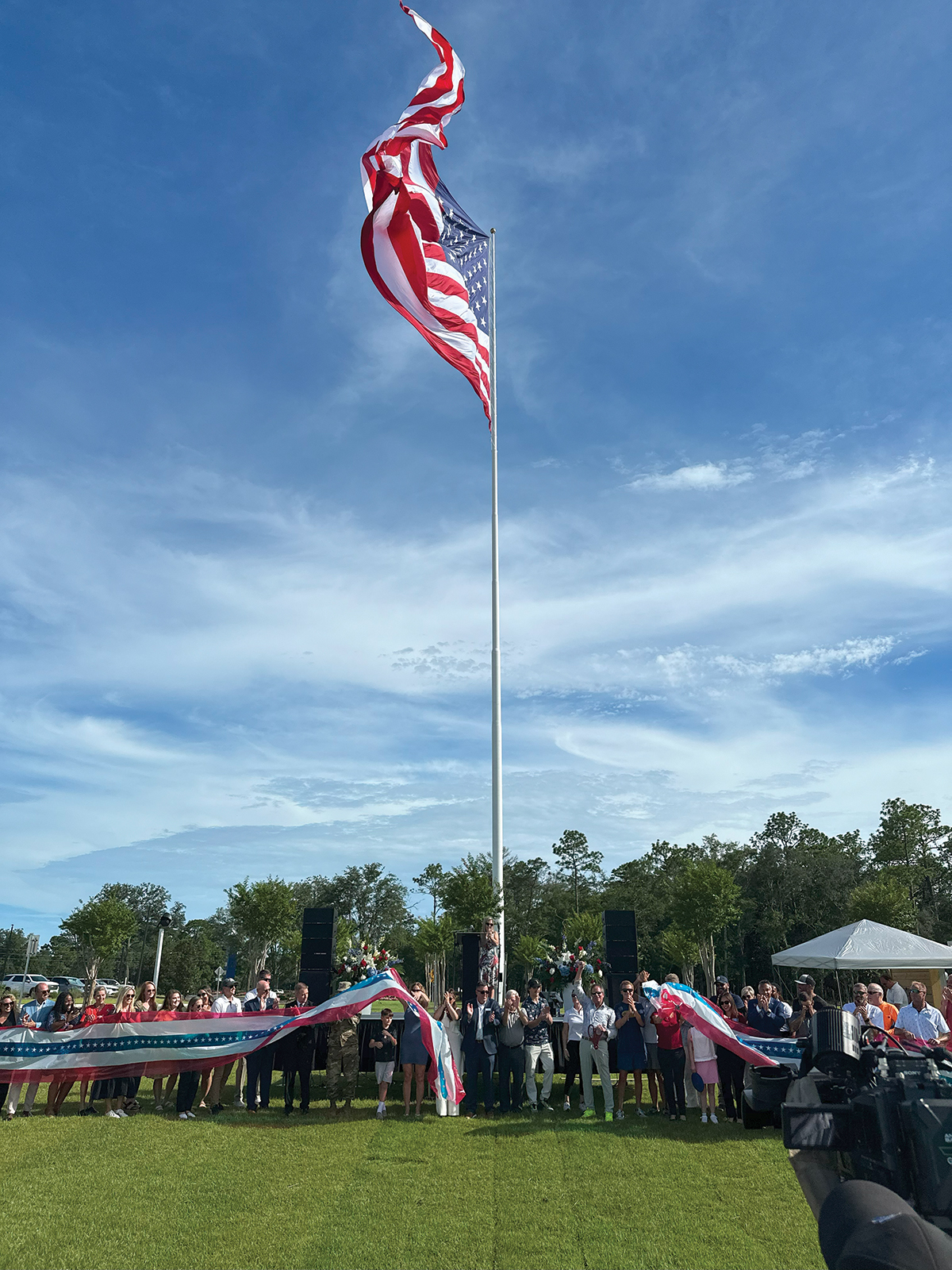 The ceremony featured raising one of Florida’s largest American flags, measuring an impressive 105 feet by 70 feet, on a towering 200-foot pole. The flag, visible from as far away as the Shalimar Bridge, symbolizes the unity and strength of the community under the motto, “We Fly as One.”