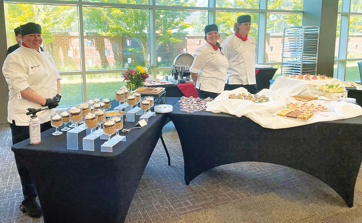 In August, Chef Layne Eggers and Chef Tim Yeabower showcased the talent of their culinary students. They instructed and helped seven students prepare 80 interactive desserts including tarts, cakes, mousses, tiramisu and bananas foster, on 21 eight-foot tables. Yes, that is 168 feet of gastronomic delight.