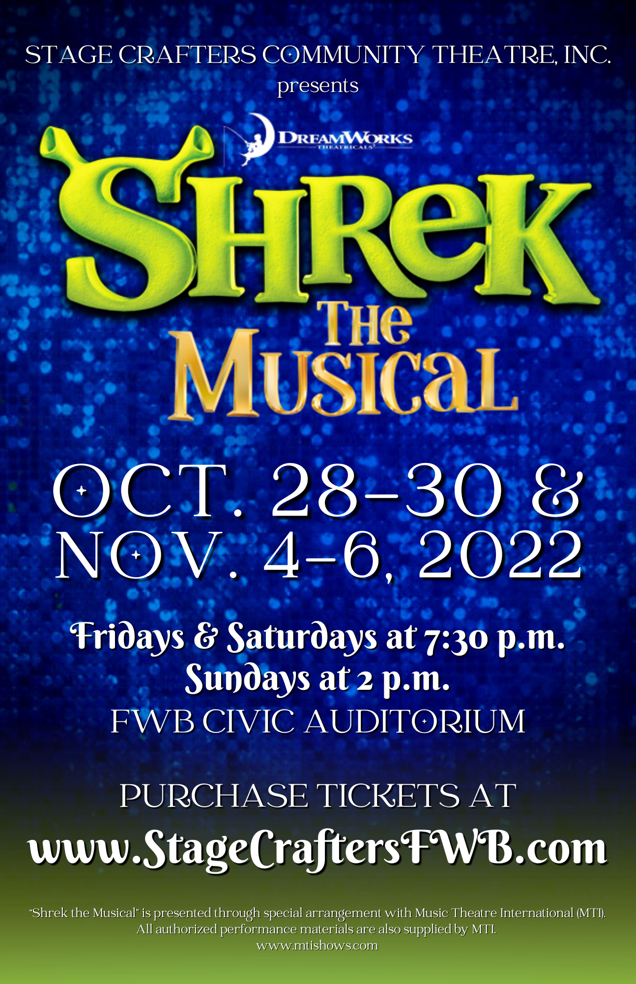 “Shrek The Musical,” directed by Craig Ewing. Based on the Oscar-winning DreamWorks Animation film, Shrek The Musical is a Tony Award-winning fairy tale adventure. Irreverently fun for the whole family, this local Stagecrafters show proves that beauty is truly in the eye of the ogre.