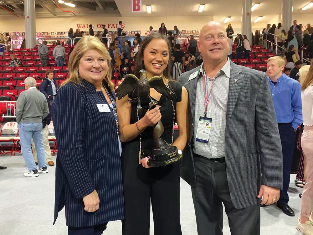 Every February the prestigious Taylor Haugen Trophy is awarded to a high school senior who best demonstrates Taylor Haugen’s balance between academics, athletics, leadership, community service and faith. The Trophy is awarded in conjunction with the All Sports Association and co-presented with Danny Wuerffel at the Buck Smith FCA Breakfast. The annual Trophy winner receives a $1,000 scholarship and a trophy that stands 26” tall, weighs 35lbs, and is a hand-sculptured bronze eagle taking to flight on a ribbon of air as inspired by Isaiah 40: 30-32. Starting in 2021, the athletic department of the Trophy winner’s school will receive a $1,000 donation from the Taylor Haugen Foundation.
